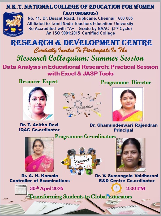 N.K.T. National College of Education for Women is situated at the heart of the Chennai city at Triplicane. The College is built in an area of 3.06 acres, where a model school is also housed…